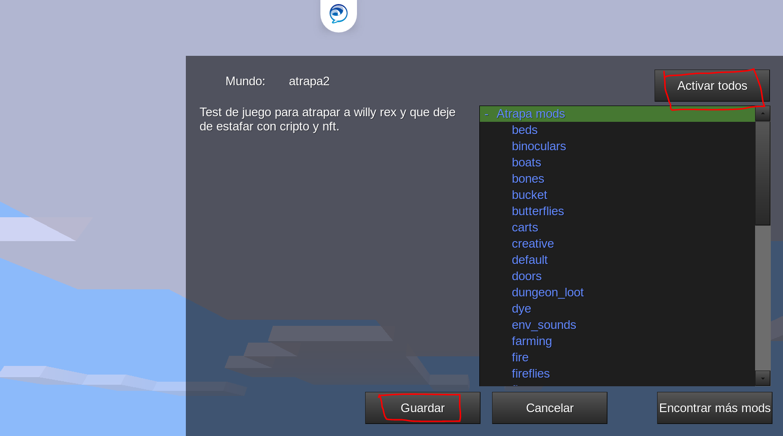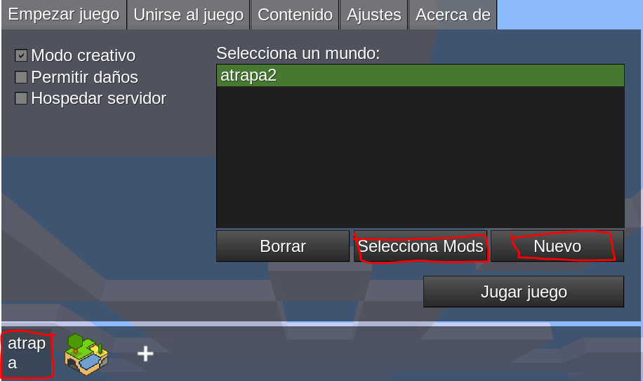 Una vez tengamos el resto de mods copiados, tan solo tendremos que arrancar, minetest, eliges abajo nuestro juego «atrapa»(no tiene ningún icono asociado porque no lo hemos generado), configurar y activar todos los mods, y crear un nuevo mundo.
