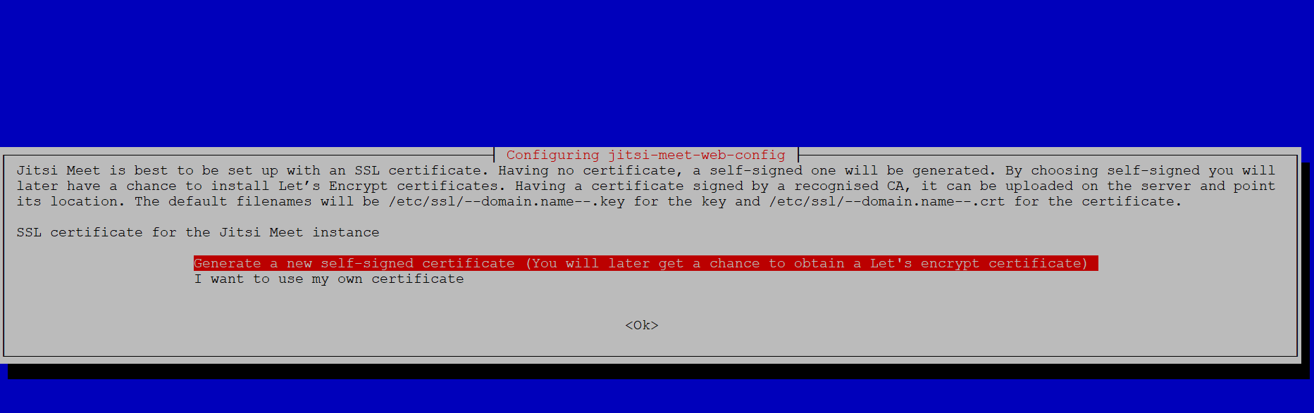 En el siguiente paso nos generara un certificado SSL autofirmado o bien podemos usar uno que ya tengamos generado con Letsencrypt o otra CA