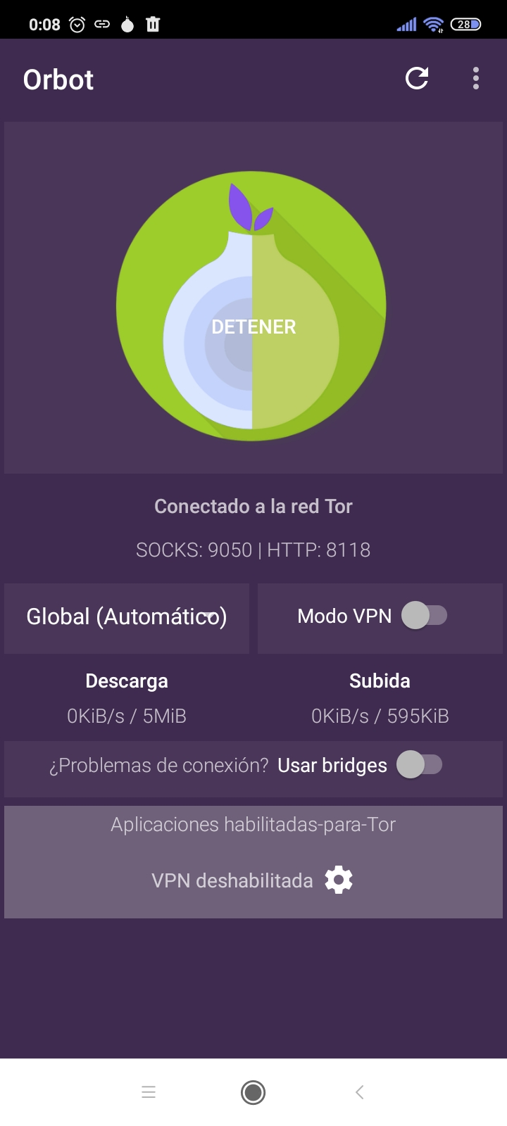 • Marcamos la opción conectar vía tor y volvemos a la pantalla principal.